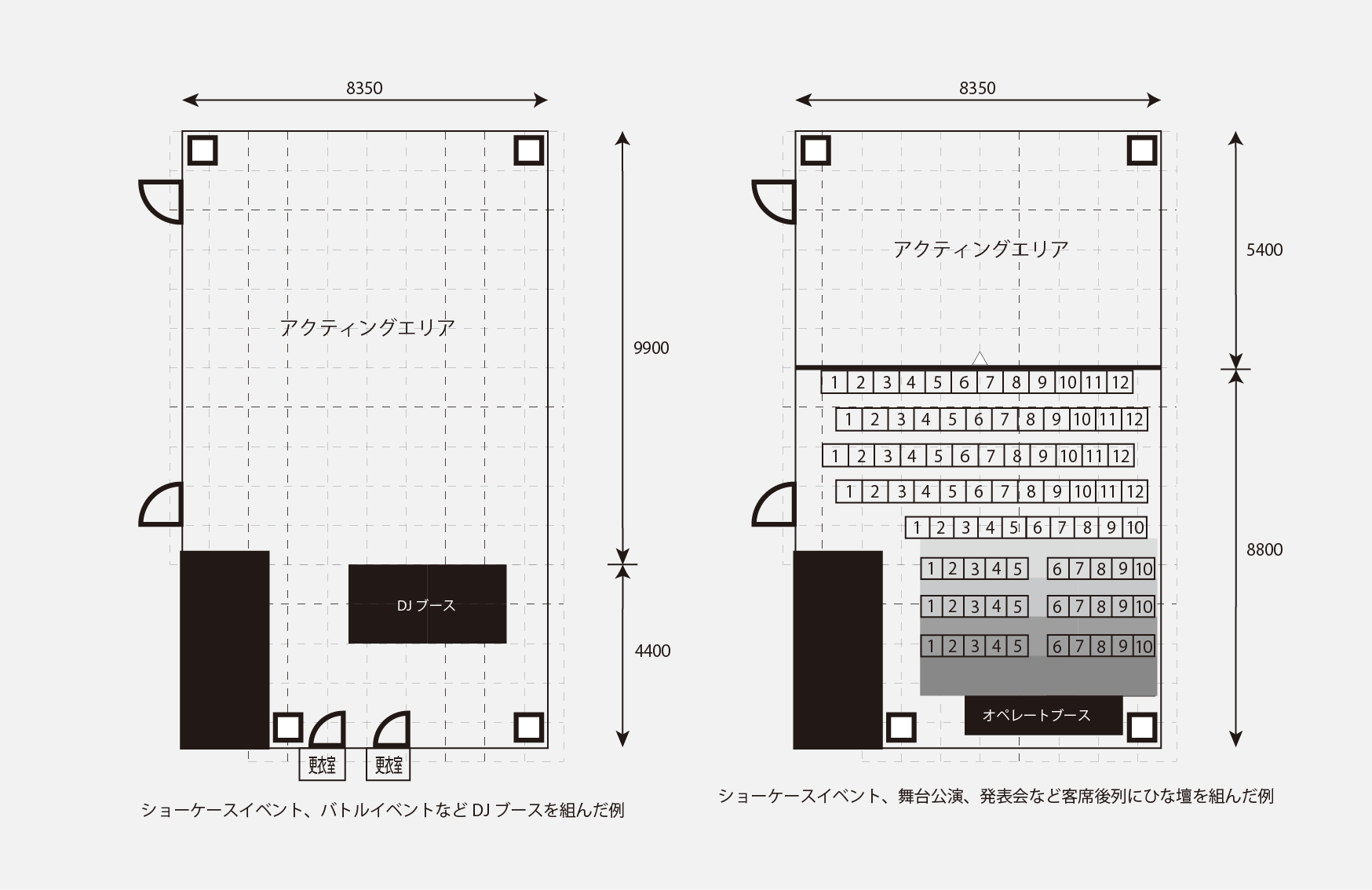 ダンスバトル、ダンスショーケース、舞台公演、展示会、フラットな空間ですので内容問わず対応出来るイベントスペースです。