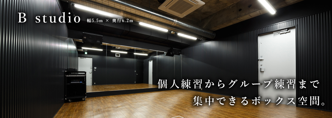 横幅が5.5m、縦幅が6.2mあり、金額もお手頃なため、少人数で行う練習に向いているスタジオとなっております。個室型更衣室が一部屋あり、Aスタジオと同様にスマホホルダーをご用意しております。その他、打ち合わせ、舞台や芝居のセリフ合わせ、余興練習などプライベート感のある空間です。
